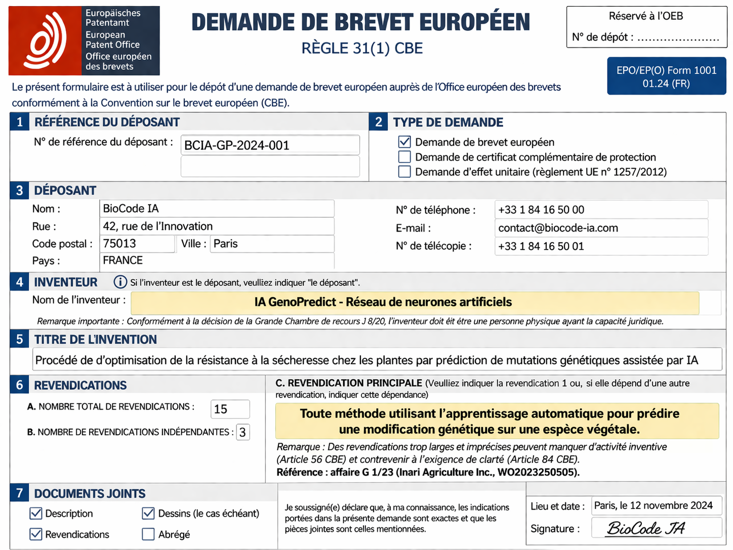 Votre mission : À la lecture des mentions portées sur ce formulaire, soulevez les deux moyens de nullité ou de rejet absolus qui frapperont cette demande. Vous fonderez votre raisonnement sur la décision J 8/20 de l'OEB (Affaire DABUS) concernant la capacité juridique , ainsi que sur les récents débats entourant la demande WO2023250505 (Affaire Inari) relatifs à l'absence d'activité inventive humaine dans les sélections massives par algorithme